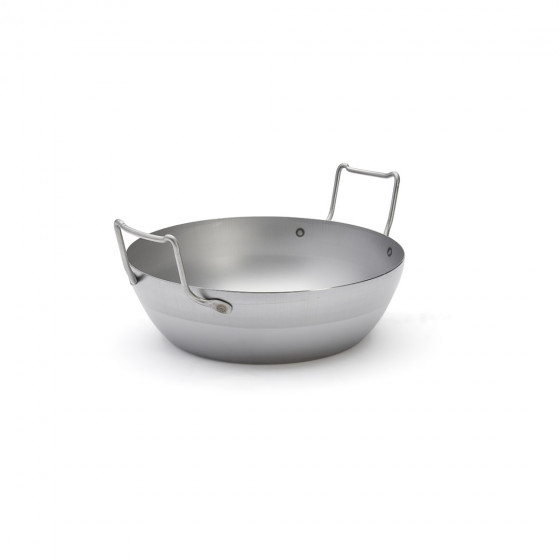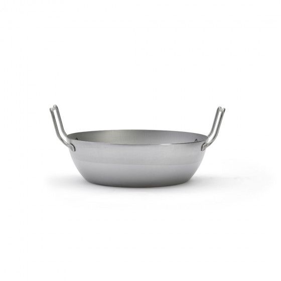 O aço carbono aquece depressa, distribui o calor de forma homogénea e, com o uso, ganha uma película natural antiaderente. As duas asas soldadas e a espessura optimizada tornam a fritadeira leve e estável, facilitando o manuseamento. É indicada para fogões a gás, eléctricos e de placa radiante (não deve ser usada em indução nem forno, e a utilização em vitrocerâmica não é recomendada).