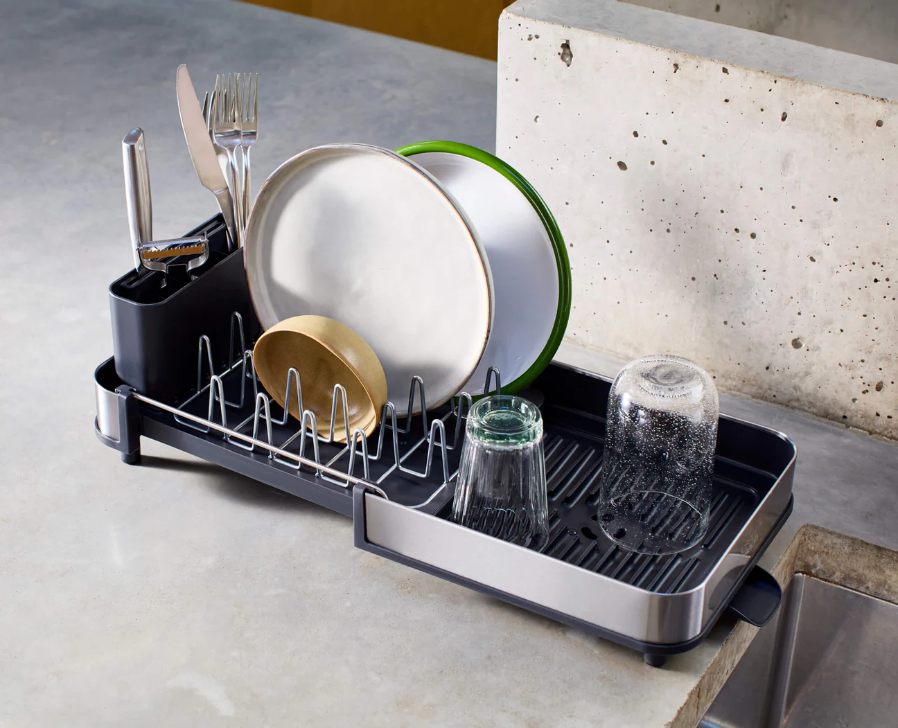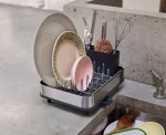 Este escorredor de loiça compacto foi pensado para cozinhas com pouco espaço, podendo ser expandido sempre que necessário para uma área adicional para secagem. O tabuleiro deslizante permite aumentar facilmente a capacidade, tornando-o uma solução prática e funcional para o dia a dia.