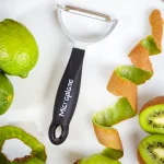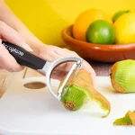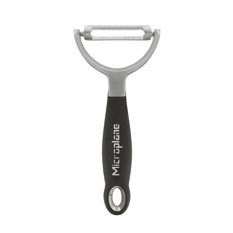 Descascador premium com lâmina serrilhada de duplo fio em aço inoxidável, ideal para batatas, cenouras e muito mais. Também útil para laminar finamente alface/couve.